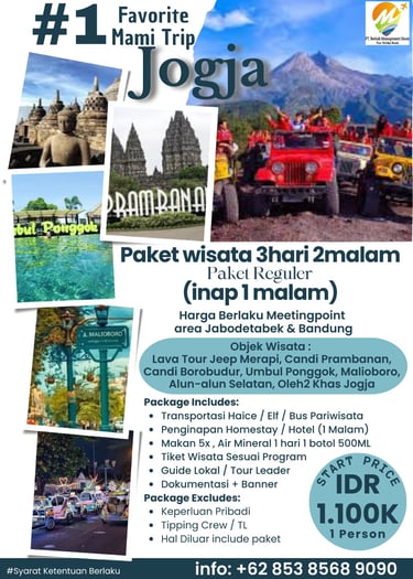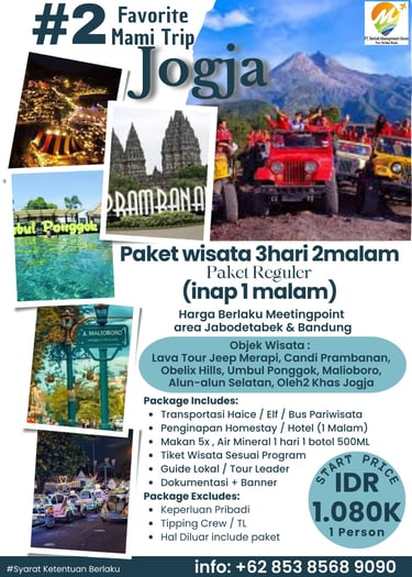 Paket Jogja Seru 3 Hari 2 Malam dibuat untuk kamu yang ingin menikmati Jogja lebih lengkap dan lebih santai. Dengan durasi lebih panjang, perjalanan terasa lebih “leluasa”: kamu punya waktu untuk eksplor destinasi utama, kulineran, menikmati suasana malam Jogja, dan tetap bisa memasukkan wisata alam atau adventure tanpa terburu-buru.